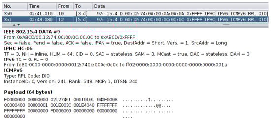 RPL is a routing protocol proposed by IETF for low-power and lossy networks (LLNs). The protocol is based on IPv6, and the network devices are interconnected in a tree topology, which is named destination oriented directed acyclic graph (DODAG) []. An RPL network can be composed of one or more instances, where each instance has a dedicated DODAG. In addition, a DODAG is formed by one root node that operates as the main maintainer of the entire graph, and by the rest of the nodes that adapt their topology according to a set of exchanged messages among all the nodes inside the transmission and reception range. The purpose of the RPL tree topology is to allow the nodes in the network to find the best path based on a rank metric. The rank is set by each node, depending on the distance to the root node, and by the link cost (i.e., the quality of the link) of the nodes in range. This metric allows nodes to provide information about their own position to the rest of the nodes in the network to enable the others to choose the best parent. As the distance from the root node increases and the link quality becomes poorer, the node rank will continue to increase, and vice versa. Hence, the RPL protocol provides ICMPv6 control messages, which are sent and received by the network nodes. The purpose of these messages is, for example, to receive information about the neighbours of a node (i.e., nodes in range) or to be able to select the parent by providing the best path to the root node. The relevant RPL control messages are the following []: