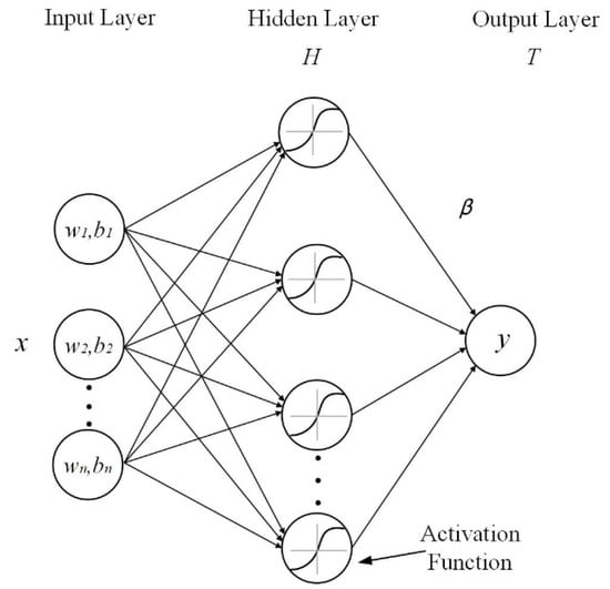 Compared to the RBF algorithm, which features an iterative parameter generation process, ELM, which instead features a random parameter generation process, has a much faster training speed. The structure of ELM is shown in