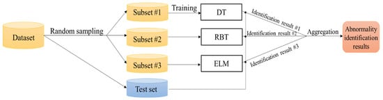 Ensemble learning for abnormality identification is achieved via the following steps. (1) The training subset is generated by randomly sampling the dataset, which can effectively reduce the training time consumption; (2) each subset is then input into each algorithm (DT, RBT, ELM) correspondingly, which ensures that the algorithm can comprehensively learn data characteristics; (3) the input of the test set into each model will then provide the identification results; (4) lastly, the results are aggregated to obtain the final abnormal identification results. The entire processes above can be visualized as