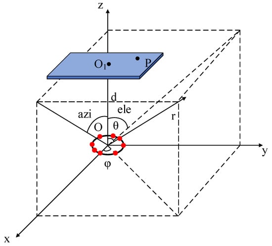 Figure 1 shows the coordinate system for the array antenna and the target. O is the geometric center of the array antenna. is the geometric center of the target. d is the distance between O and . The position vector of the n-th antenna units is . P is any point on the target. is the vector position of the beam point. and are the spherical coordinate angles of .