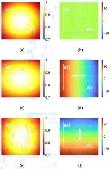 From formula (4), when , the phase gradient is along the azimuth angle (), and when , the phase gradient is along the elevation angle (). By changing the feeding coefficient of each unit (), the equivalent feeding positions ( and ) also change, and the magnitude and direction of the phase gradient of the generated beam can be adjusted accordingly.