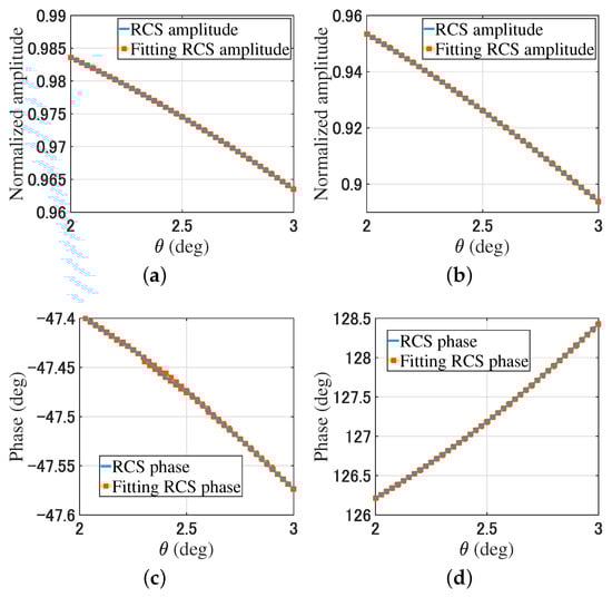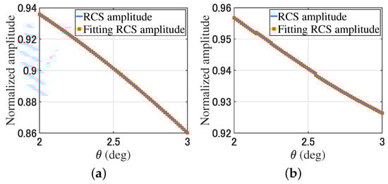 For the monostatic RCS simulation, the receiving antenna array and transmitting plane beam rotate along the y-axis around the geometric center of the object in a range of , and the angle interval is . The monostatic RCS is . By changing the phase gradient of the modulated beams, from (9), the fitting monostatic RCS is . Figure 6 provides a comparison of the monostatic RCS and the fitting monostatic RCS of the plate and trihedral corner reflector through (9).