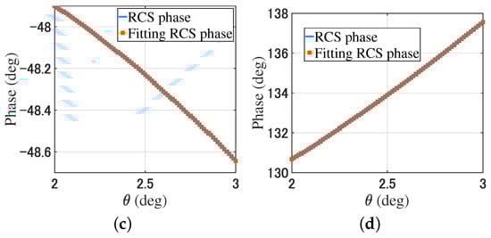 In Figure 5 and Figure 6, the RCS is obtained by rotating the receiving array with a total of 11 data points. After rotating the receiving array, the fitting RCS is obtained by changing the phase gradient of the modulated beam using (7) and (9). There are nine fitting RCS points near each RCS point. For the plates and trihedral corner reflectors, the simulation results show that the RCS data and fitting RCS data have high consistency.