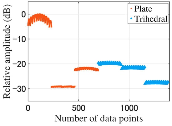 Radar target recognition plays an important role in military reconnaissance [], automatic driving [], security imaging [], geologic examination [], and ocean remote sensing []. In target recognition, increasing the dimension of features can improve the recognition accuracy []. For example, when a polarimetric feature is introduced into radar target recognition, a dataset with one more dimension can be obtained, which can improve recognition accuracy []. D. Perissin used polarization information to distinguish urban-targets []. V. Vassilev made it possible to infer the ground surface type by using a polarimetric radar []. G. Xiong utilized polarization information to distinguish a ship target through a deep network []. The polarization characteristics also have limits. For example, when different targets share the same polarization scattering matrix, such as plates and trihedral corner reflectors, it is difficult to distinguish them in the polarization dimension []. Jafari. M found that the polarization characteristics of the plates and trihedral corner reflectors are the same and cannot be distinguished []. For the same reason, the plates and trihedral corner reflectors are not used together in the polarization calibration of the polarization synthetic aperture radar [,]. Therefore, it is difficult to classify the plates and trihedral corner reflectors through polarization or amplitude characteristics of the target.