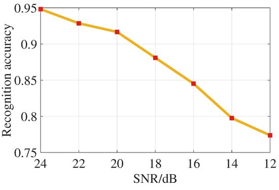 Next, we discuss the impact of signal-to-noise ratio (SNR) on this work. In order to discuss the recognition effect under different SNRs, we chose the antenna array with an aperture of 20, which has a phase gradient for feature extraction of . The recognition accuracy at different SNRs is shown in Figure 10.