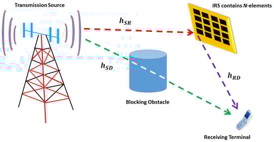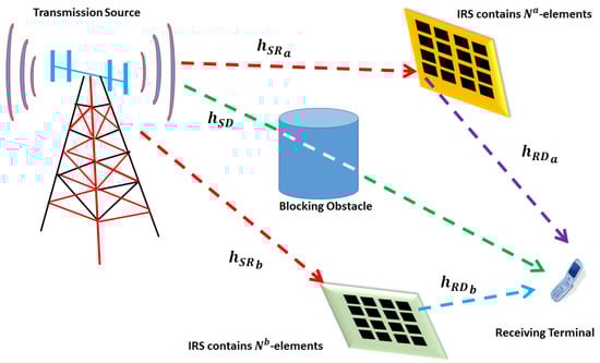 For simplicity, the considered scenario will include only two IRSs, indexed with a and b, respectively. At the destination, the receiving device receives reflected signals from -reflective surfaces, in addition to the direct signal from the source, as clarified in Figure 2. This is to emulate the real-time case where the receiving device could be moving and transferring from the coverage area near one reflective surface into another with a different reflection surface installed, as illustrated in Figure 2. The received signal by the destination could be expressed as