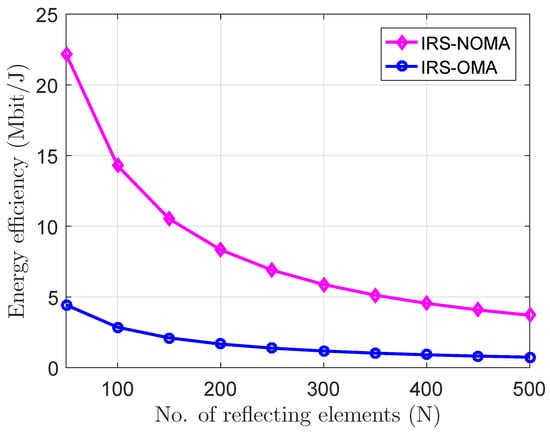 Despite the fact that IRS-NOMA offers better outcomes than IRS-OMA, Figure 3 shows that EE trends in general are declining for both systems, which reflects the fact that higher N levels lead to more power consumption and more non-useful wave scattering, which causes power wastage, and therefore is non-energy efficient. It is worth mentioning that, from Figure 3, the EE decreases continuously as N increases; however, this merely extends to a certain level, and then EE starts to reach a steady state where increasing N is not effective.