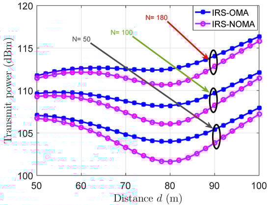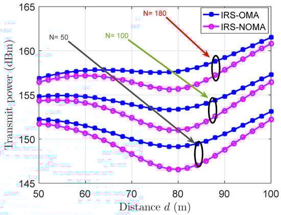 To test the IRS-NOMA and IRS-OMA abilities to achieve given target rates, Figure 4 and Figure 5, respectively, show the required transmission power by both systems to reach a predetermined target rate, and at the same time, maintain successful transmission over a given distance between the source and the destination. To examine the effects of all the respective variables, the two figures considered three different N scenarios: 50, 100, and 180, besides varying the target rate between 50 Mbit/s and 100 Mbit/s, over several d measurements. It is worth mentioning that the achievable target rate for the users of both systems is affected by several factors such as the available transmission power allocated to each user and the channel conditions of each user. Increasing the distance or placing the destinations at farther locations will degrade the performance to a point where the users with bad channel conditions will need more transmission power to achieve a given target rate. It can be concluded from both of these figures that IRS-NOMA requires less power than its orthogonal peer. This proves and confirms that IRS-NOMA requires less transmission power, and hence, is more energy efficient than IRS-OMA for various destination locations.