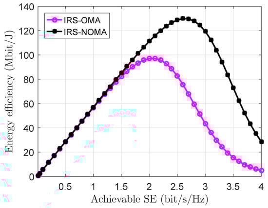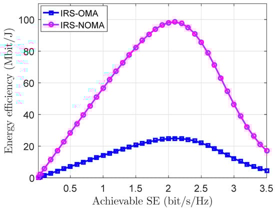 Figure 6 displays the EE-SE trade-off for IRS-NOMA against IRS-OMA. This figure shows that the EE-SE relationship is a convex function of SE, and it also illustrates that IRS-NOMA considerably outperforms IRS-OMA in terms of the achievable EE for different SE levels.