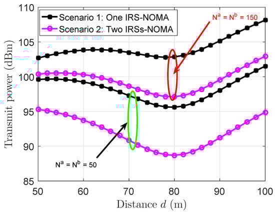 Figure 7 displays a comparison between the proposed two-IRS-assisted NOMA system against the conventional IRS-NOMA system. The comparison is made in terms of the required transmission power over the distance to achieve a target rate of 100 Mbit/s and for N = 50 and N = 150 cases. It is obvious from this figure that the proposed two-IRS-assisted NOMA offers better results than the conventional IRS-NOMA. For instance, for the case, at a distance of 80 m, the proposed two-IRS NOMA requires a transmission power at around 98 dBm, while the conventional IRS-NOMA requires about 103 dBm. It must be noted that it is possible to achieve a higher target rate when the channel power (channel conditions) is good; however, the users with poor channel conditions might face a considerable challenge to maintain a higher target rate without adopting a higher transmission power.