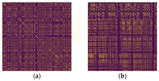 The fault data are encoded and converted into a 2D image by RP after VMD feature extraction, and the encoded image is shown in Figure 1. Figure 1a shows the fault data converted directly by RP to 2D image without VMD extraction, and Figure 1b shows the fault data converted by RP to 2D image after VMD extraction.