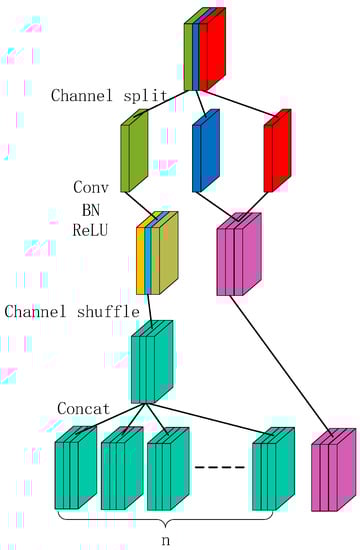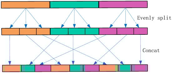 In order to further improve the feature extraction capability of the residual network and enhance the performance of the deep neural network, this paper proposes a channel split residual network by constructing a channel split (CS) layer instead of the first convolutional layer in the original residual network, and the flow chart of the CS layer is shown in Figure 3. Firstly, the 1D bearing vibration signal is converted into a three-channel 2D picture containing the fault characteristics by the picture conversion method, and then the three-channel picture is input to the network for channel splitting, one of the three channels is selected as the primary operation channel, and the other two channels are secondary operation channels. The channel mixing operation is illustrated in Figure 4. After that, the secondary operation channel is expanded to three channels by convolution. Finally, expanded primary operation channels are stacked n times so that the number of channels is the same as the number of channels in the first convolutional layer of the residual network, and then the secondary operation channels are spliced after the primary operation channels.