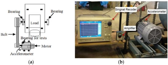 Experiment setup for the rolling bearing fault diagnosis. (a) Illustration of the rotation machinery and (b) the motor in the field.