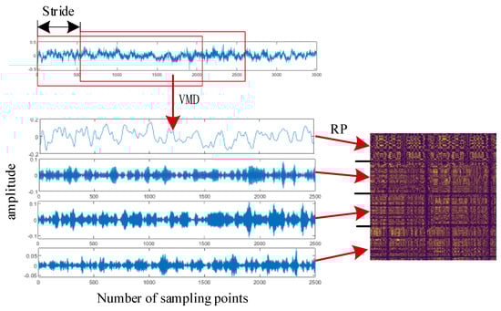 Firstly, the data on the JNU data bearing set was extracted by VMD, then the extracted data was transformed by RP into a feature map, and the resulting feature images were divided into training and test sets according to a ratio of 7:3 for the transformed data set. The data interception method is shown in Figure 7.