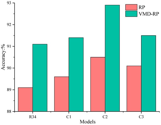 In order to verify the improvement effect of CS layer on the diagnostic accuracy of the model, Jiangnan bearing data containing 10 fault states was selected as the experimental object, and RP and VMD–RP were adopted to convert the fault data and input into the residual network for training and diagnosis, respectively. At this time, the data conversion step was 4096, and the experimental results are shown in Figure 8. When VMD–RP was used to convert the data, the fault diagnosis accuracy of the residual network was 91.1%, which was a 2% improvement compared to the direct conversion of the fault data using RP. When the CS layer was added to the model and the feature maps generated using VMD–RP were input to the model for training and fault classification, the diagnostic accuracy achieved by the model was 92.9% when the main operating channel in the CS layer was channel 2, which was 1.5% and 1.4% higher than when channel 1 and channel 2 were selected as the main operating channels, respectively, and 1.8% higher than when the CS layer was not added. Diagnostic accuracy is the demonstration of the ability of the CS layer to improve the fault diagnostic accuracy of the model. C1, C2, and C3 represent the CSRN models constructed with channels 1, 2, and 3 as the main operational channels for the channel split operation, respectively.