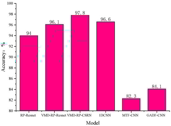 In order to demonstrate the diagnostic capability of VMD–RP–CSRN for bearing faults, the two-dimensional images generated when the data interception step was 512 were taken as the experimental data, used RP and VMD–RP to encode the data respectively and then input them into Resnet for fault diagnosis. The experimental results are shown in Figure 9. For RP, the fault diagnosis accuracy achieved by the model was 96.1%, which is 2.1% higher than that when RP is used as the data conversion method; when the data encoding method was VMD–RP and the diagnosis model was CSRN, the diagnosis accuracy achieved by the model was 97.8%, which is 1.7% higher than that when Resnet is used as the diagnosis model. In addition, to highlight the superiority of the VMD–RP–CSRN diagnostic model, 1DCNN, MTF–CNN [], and GADF–CNN were used to diagnose the fault data as a comparison, and it can be seen from Figure 9 that the proposed diagnostic method improved the fault diagnosis accuracy by 1.2%, 15.5%, and 13.7%, respectively, compared with the comparison method.