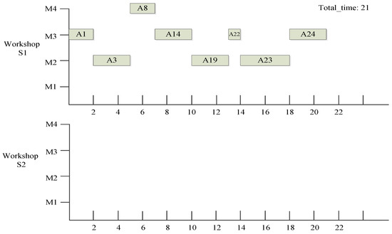 Next, the following process in the process queue is called A2. The processing device of process A2 is m3. Because it is a two-workshop scheduling problem with the same device resources, there are two M2 processing devices, one in workshop S1 and another in workshop S2. Based on the two-workshop timing algorithm, the trial scheduling time points of process A2 in workshops S1 and S2 are S1:2, S1:10, S1:14, S1,21, and S2:3. Among them, the total processing times of process A2 scheduling scheme obtained in the S1:2, S1:10, S1:14, S1:21, and S2:3 time point scheduling are 21, 21, 21, 23, and 21, respectively. We selected the process A2 scheduling scheme with the minimum total processing time. At this time, the total processing time of S1:2, S1:10, S1:14, and S2:3 is the minimum value of 21, indicating that the trial scheduling time point with the minimum total processing time is not unique. Then, we selected the time point with the earliest processing start time, that is, S1:2. The scheduling scheme of process A2 is shown in Figure 4.