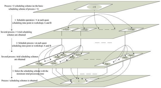 Figure 7 is the schematic diagram of the backtracking adjustment strategy of two workshops when the backtracking parameter is 1. In Figure 7, the total processing time of the process i scheduling scheme has exceeded its “scheduling reference time.” The previous process of process i is process (i − 1), so it is necessary to reschedule process (i − 1). The basic scheduling scheme of process (i − 1) needs to be determined, and the scheduling scheme of process (i − 2) will be used as the basic scheduling scheme of process (i − 1). Therefore, we found the quasi-scheduling time point of the process i on the process (i − 2) scheduling scheme, scheduled process (i − 1) on each quasi-scheduling time point, and obtained several process (i − 1) quasi-scheduling schemes. Then, we found the quasi-scheduling time point of process i in the quasi-scheduling scheme of each process (i − 1), scheduled process i, and obtained several quasi-scheduling schemes of process i. Finally, among several quasi-scheduling schemes of process i, the scheme with the lowest total processing time was used as the scheduling scheme of process i.