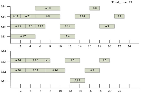 Because the proposed algorithm is the result of the theoretical analysis and is not based on specific examples, it has universal significance. To help readers understand the algorithm, the proposed algorithm and the algorithm in [15,16,17,18] were applied to a single order of a manufacturing enterprise as an example to illustrate the advantages of the proposed algorithm. Product A consists of 24 processes and is processed on four devices. The reverse processing process tree of the product is shown in Figure 1. The number in each node of the process tree means the process number/processing device number/processing time. We used [15,16,17,18] algorithms and the proposed algorithm to schedule product A. When applying [15,16,17] to schedule products, the number of process migrations was not recorded. Instead, when the immediate process migration was caused by the scheduling of the process, the required migration time was arranged before the processing start time of process. That is, the processing start time of processmust be greater than or equal to the sum of the processing end time of its immediate process and its migration time. The dispatching Gantt chart is shown in Figure 5, Figure 6, Figure 8, Figure 9 and Figure 10. In each figure, the upper workshop is the S1 workshop, and the lower workshop is the S2 workshop.
