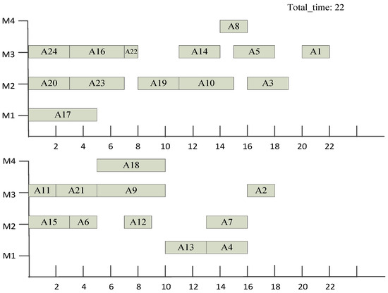 First, the process sequence sorting strategy was used to sort them. We calculated the path length of the current leaf node, and the results are as follows: A17:14, A21:18, A24:21, A11:17, A15:13, and A20:16. Therefore, the path length of A24 is the longest. We took all the processes on the path of A24 as the first process sequence (also the longest process sequence). These processes were inserted into the process queue line: A1, A3, A8, A14, a19, A22, A23, and A24. At the same time, they were deleted from the product process tree.