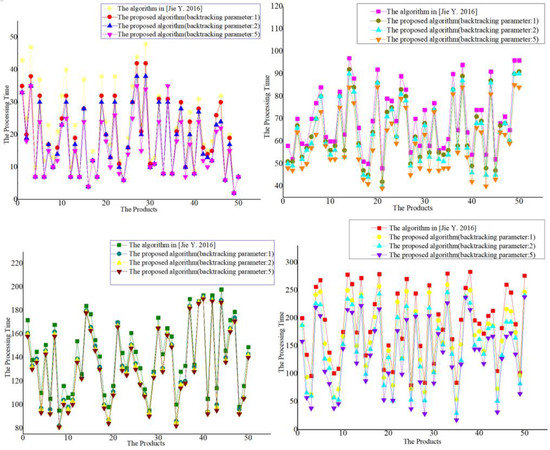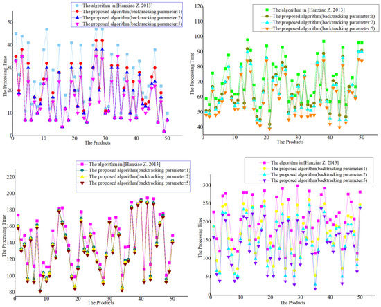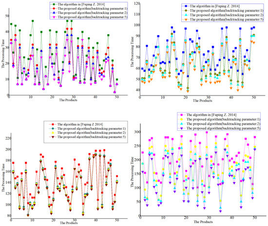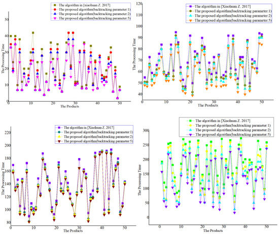 It can be seen from the experimental results that the scheduling results of the algorithm proposed in this paper are significantly better than those in [15,16,17,18]. For the algorithm proposed in this paper, the larger the backtracking parameters, the better the scheduling results.
