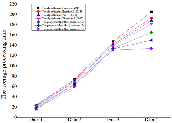 This section will verify the effectiveness of the algorithm. In the experiment, four groups of data were randomly generated in different data ranges. Data 1: the number of processes is 3–10, the processing time of each process is 1–6, and the number of devices is 3–5; Data 2: the number of processes is 10–20, the processing time of each process is 1–6, and the number of devices is 3–5; Data 3: the number of processes is 20–30, the processing time of each process is 1–6, and the number of devices is 3–5; Data 4: the number of processes is 30–40, the processing time of each process is 1–6, and the number of devices is 3–5. Each group of data will randomly generate 50 products. Because the product structure is random, it can effectively prove the algorithm’s effectiveness in different cases. Then, the proposed algorithm (the backtracking parameters are 1, 2, and 5, respectively) is compared with [15,16,17,18], as shown in Figure 11, Figure 12, Figure 13, Figure 14, respectively. The comparison of the average scheduling results of each algorithm is shown in Figure 15.