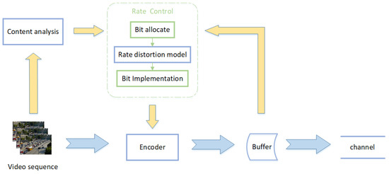 Under the continuous influence of the novel coronavirus pneumonia epidemic, people are gradually staying at home for longer periods of time. In order to build a bridge of communication between people, the volume of video-related services such as short video and video conferencing has been gradually increasing. According to reports [1,2,3], mobile web traffic has doubled in the past two years since the first quarter of 2020, and 80% of all videos created in 2021 are user-generated; in 2022, video resources are estimated to account for 82% of all IP traffic. Uncompressed video is huge and usually needs to be encoded for transmission. In recent decades, in order to achieve high-quality, high-resolution video storage and transmission, the Video Coding Experts Group (VCEG) of the International Telecommunication Union Telecommunication Standardization Sector (ITU-T) and the Moving Picture Experts Group (MPEG) of the International Organization for Standardization (ISO)/International Electrotechnical Commission (IEC) has released a series of international video coding standards: from the previous Advanced Video Coding (AVC/H.264) [4] and HEVC/H.265 [5] standards to the latest video coding standard (VVC/H.266) [6]. Although each standard has significant changes, a hybrid coding framework consisting of modules such as block segmentation, intra-frame prediction, inter-frame prediction, transform, quantization, entropy coding, and loop filtering is still used. The encoder will then use this hybrid coding framework to remove the temporal, spatial, and information entropy redundancy in the unprocessed video to achieve high-performance video compression. The main changes of the new generation standard are as follows: The HEVC standard introduces a quad-tree-based block division scheme, supports 35 intra-frame prediction modes (including 33 types of angle prediction), provides new inter-frame prediction technologies (including motion information fusion technology (Merge), motion vector prediction technology (AMVP) and merge-based skip mode), and realizes the compensation of reconstructed pixel values through sample adaptive offset (SAO) technology and the use of advanced context-based adaptive binary arithmetic coding (CABAC) for entropy coding, etc. The VVC standard adds binary and ternary tree schemes to block division and supports 67 intra-frame prediction modes (including 65 angle prediction modes). Inter-frame prediction also adds an extended Merge mode and bidirectional optical flow technology. Affine motion compensated prediction and other technologies add luma mapping with chroma scaling (LMCS) and an adaptive loop filter (ALF) to the loop filter. In the hybrid video coding framework, rate control is not added as a separate module, but this does not mean that rate control is not important.