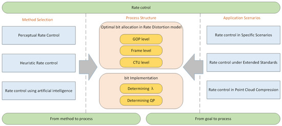 Before we begin to explore the latest developments in rate control, let’s take a look at the general framework of the current study, as detailed in Figure 3. There are two main research trends: from method to process and from goal to process. The first one starts from the basic method and focuses on the performance of various video sequences in general, and the other one starts from the real environment and focuses on the performance of video sequences under current constraints.