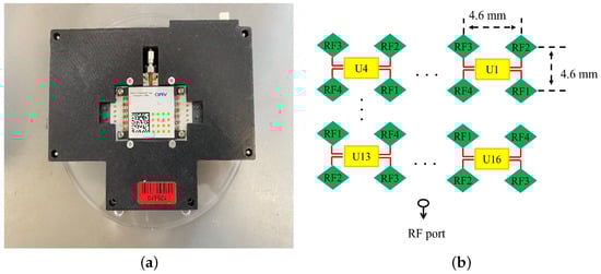 (a) Photograph and (b) chips and antennas layout of the 8 × 8 AiP model.