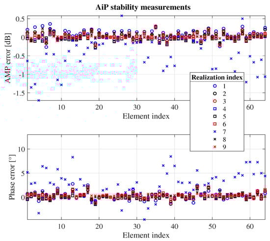 The complex least squares method in [23,36] is used here to estimate the calibration coefficients of the AiP elements for 10 repetitions. To investigate the effect of temperature on the stability of the AiP, the AiP is turned on for a period of time to warm up before the calibration measurements, and the first to sixth calibration measurements are performed after the temperature has stabilized. After the sixth calibration measurement, the AiP is turned off to allow it to cool down, and then the AiP is turned on again to perform the seventh through tenth calibration measurements immediately. It is worth mentioning that during each calibration measurement, the temperature of the 16 element chips of the AiP is recorded before each elements phases are reset.