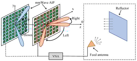 The measurement of beamforming patterns of the AiP is also carried out in the CATR, and the block diagram of the AiP beamforming pattern measurement setup is depicted in Figure 6. Similar to the calibration measurement system setup, the operating mode of the AiP is set to Rx and is placed on the CATR turntable. The AiP performs beamforming in the horizontal plane and AiP output power values are measured by the VNA.