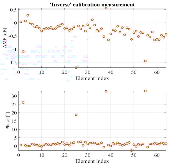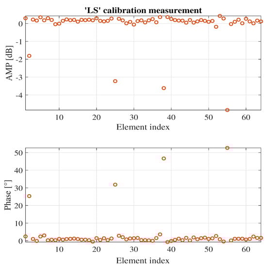 The 8 × 8 AiP array with 64 elements is a large array. In this part, this AiP array is used as a validation platform, and the effectiveness of three typical phased array calibration methods: ‘on-off’, ‘inverse’ and ‘least squares’ on large phased array calibration is investigated. Some work has been carried out to investigate the calibration accuracy of these three methods on small and medium phased arrays [22,23,36,37]. For the ‘inverse’ calibration measurement, we first activate all antenna elements of the AiP and set their phase shifter and attenuator to 0° and 0 dB respectively. The S-parameter between the AiP and the chamber probe antenna is recorded. Then the phase shifter and attenuator of the mth element are set to −180° and 0 dB in turn for , while the phase shifter and attenuator of the remaining antenna elements are still set to 0° and 0 dB respectively. The S-parameter between the AiP and the chamber probe antenna is also recorded. Finally, the initial excitation of the mth element is obtained.