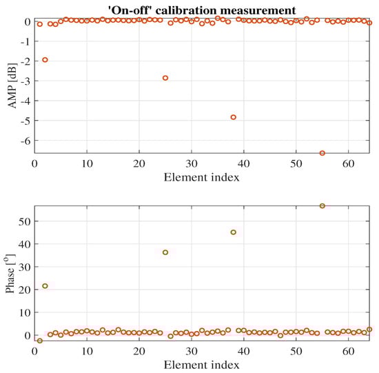 Further, the calibration method is replaced by the ‘on-off’ and ’least squares’ methods, taking repeated calibration measurements as described above. The AiP array calibration excitation matrix of ‘least squares’ method is based on the Hadamard matrix [23,36], and the condition number is 1, so the phased array calibration is less affected by the measurement noise. The obtained measurement results are shown in Figure 10 and Figure 11, respectively. The errors between the calibration results of these two methods for the four intended changed elements and the corresponding reference values are shown in Table 1. The measurement results show that both methods are able to perform effective measurements on the AiP array, though there are some errors as expected as well. The errors are mainly introduced by two factors: one is the limited control accuracy of the element attenuator and phase shifter and the second is that during the measurement, there is some measurement noise. In particular, when the element complex filed amplitude is small, the measurement noise has a large impact on the ‘on-off’ calibration accuracy. As shown in Table 1, the calibration error of the ‘on-off’ method for the amplitude of the fourth element reaches 1.5 dB.