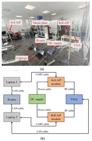 AiP system combines all the antennas and control circuits of a phased array system into a single package. This allows for low development and maintenance costs, fast product iterations, easy installation and portability, and low operational energy consumption. AiP technology has been widely used in mmWave, for instance, radios, automotive radars, imaging sensors [19,20,21]. In this paper, the main hardware and control architecture of an 8 × 8 AiP which is extended based on the 4 × 4 AiP design architecture presented in [22] are introduced. A series of experiments are conducted to verify the AiP stability and evaluate the accuracy of elemental composite weight control, before the application of the AiP. Further, two application examples of the AiP are presented, where the AiP is used as an experimental platform for phased array calibration and mmWave channel sounding, respectively, as detailed below: