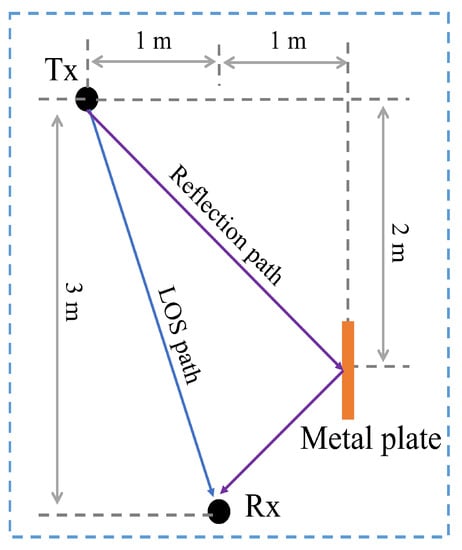 Another application of the AiP is in a mmWave channel sounder, where the 4 × 4 AiP described in [22] is employed as the Tx. The environment and system setup of the AiPs channel sounding measurement can be seen in Figure 12. The metal plate is introduced intentionally to act as a reflector in the channel environment, generating a reflection path. Both the Tx and Rx are set at a height of 1.2 m above the floor, and the exact placement of the Tx, the Rx and metal plate is illustrated in Figure 13. Port 1 of the VNA is connected to the Tx and port 2 to the Rx. The channel frequency response between the Tx and Rx is obtained by measuring the S-parameter with the VNA. Laptop 1 is used to control the Tx, laptop 2 is responsible for controlling the Rx and the VNA.