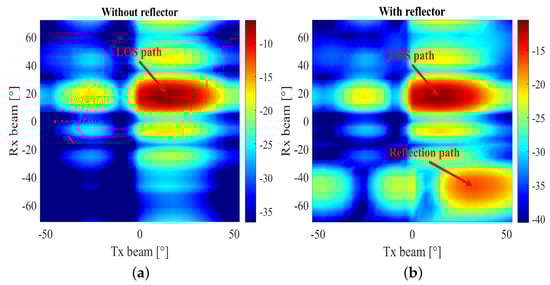 The channel sounding measurements results are shown in Figure 14a,b for without and with the metal plate scenario, respectively. The AOD and AOA of the LOS path between Tx and Rx are the same, which is 18.4° calculated according to Figure 13. It can be observed in Figure 14a that the highest peak appears when both the Tx AiP and Rx AiP steering a beam in around 18°, demonstrating that the AiPs based channel sounder is able to accurately detect the LOS propagation path in this channel.