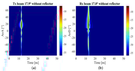 The power angle delay profile (PADP) obtained by the channel sounder for the channel without and with the metal plate when the Tx steering a beam to direction 17.9° is shown in Figure 15a. It is known that path measured is the LOS path with AoA and delay are around 18° and 12.6 ns respectively. Because of the system delay of the AiPs, the delay is larger than the calculated value of 10.05 ns. Similarly, when the Rx AiP beam-steering angle is 17.0°, the measured PADP presented in Figure 15b. The AoA and delay of the measured LOS path are around 18° and 12.6 ns respectively as well. The combination of Figure 15a,b can explain that in Figure 14a, even if there is no propagation path in the vertical and horizontal direction of the LOS path, there is still a certain amount of power lumps measured due to AiPs beam-steering pattern side lobes.