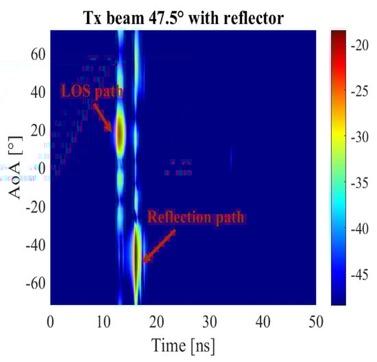 Further, when the metal plate is placed to create a reflection path between the Tx and Rx, as shown in Figure 13. The calculation shows that the AoD anf AoA of the reflection path is 45° and −45° respectively. The measurement result is given in Figure 14b. In comparison to Figure 14a, the channel sounder detects the LOS path as well as the reflection path. It can be seen that the AoA of the reflection path is around 35°, which is different from the calculated value of 45°. This is caused by position error of the metal plate and the directional beam patterns of both AiPs. In addition, when the beam-steering angle of the Tx AiP is 47.5° (the closest angle to 45° at which the Tx AiP performs beam-steering), the measured PADP for the channel is displayed in Figure 16. The measured AoA of the LOS path and the reflection path are around 20° and −45° respectively, both close to the calculated values. The measured delay for the reflection path is 14.67 ns, which is 1.33 ns larger than the calculated one. The delay error is caused by the position errors of the Tx, the Rx and the metal plate, and the system delay of the AiPs.