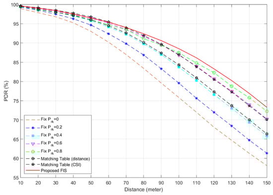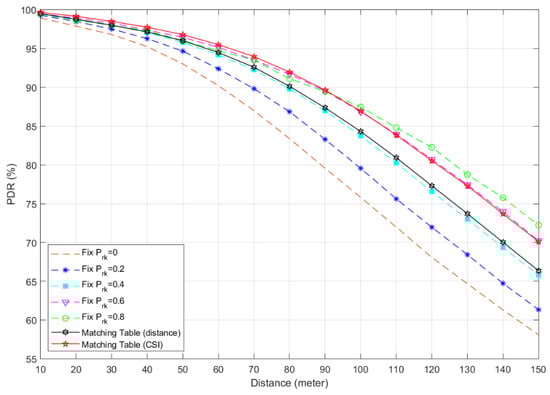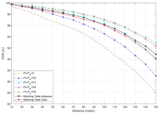 PDR performance comparison of matching table and fixed value for = 400-vehicle scenario.