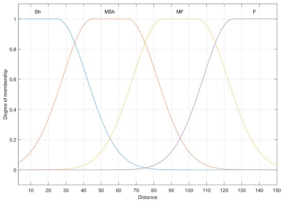 The Gaussian combination membership function was chosen to cover the entire universe of discourse of the first input distance (d). The first fuzzy input range was set to [3 150] meters. Four linguistic terms: Short (Sh), Medium Short (MSh), Medium Far (MF), and Far (F), were chosen to cover the universe of discourse of distance (d), as shown in Figure 4. The mean value for the Short (Sh) was set to [−5 25]’ for Medium Short (MSh), to [45 65]; for Medium Far (MF), to [85 105]; and we set Far (F) to [125 155]. The given threshold value was chosen from the initial observations of the fixed simulations. We analyzed and designed the curve according to the highest PDR results from the fixed observations.
