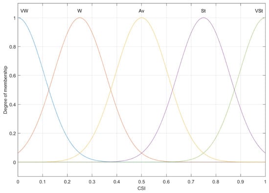 The Gaussian membership function was chosen for the second fuzzy input and the fuzzy output, named CSI and , respectively. The ranges for CSI and were set to [0 1] and [0.4 0.8], respectively. The five linguistic terms chosen to represent the universe of discourse for the CSI were: Very Weak (VW), Weak (W), Average (Av), Strong (St), and Very Strong (VSt), as shown in Figure 5. The mean values for the second fuzzy input CSI were as follows: Very Weak (VW) was set to [0], Weak (W) to [0.25], Average (Av) to [0.5], Strong (St) to [0.75], and Very Strong (VSt) was set to [1]. Again, the curve was designed based on the initial fixed Prk observations.
