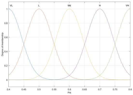 As for the fuzzy output, five linguistic terms were also chosen to explain the universe of discourse for : Very Low (VL), Low (L), Middle (Md), High (H), and Very High (VH), as shown in Figure 6. The fuzzy output range value [0.4 0.8] was chosen because the highest PDR performance from the initial observation only indicated the corresponding Prk range. The mean values for the Very Low (VL), Low (L), Middle (Md), High (H), and Very High (VH) terms were set to: [0.4], [0.5], [0.6], [0.7] and [0.8], respectively.