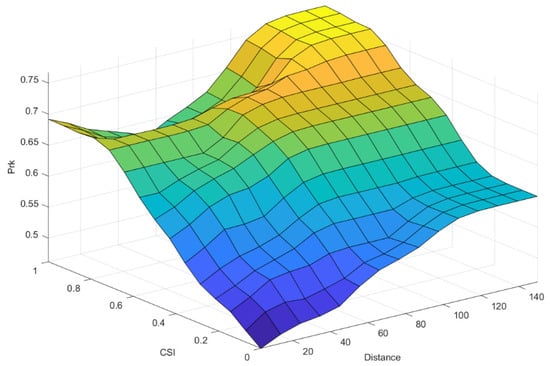 where , , and are the linguistic terms that represent the two inputs’ distance and CSI, and the output , respectively; , , and are the index of the membership function for the input distance (d), CSI, and the output , respectively; is the index of the fuzzy rule, as can be seen in Table 1. Figure 7 shows the overall 3D diagram for the proposed FIS.