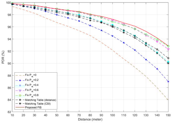 The PDR is the ratio of correctly delivered packets to the total number of transmitted packets. The PDR performance was plotted with the distance axes ranging from 0 to 150 m.