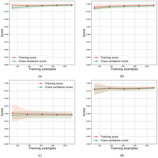 - LR: Figure 11a and Table 4 show that performance metrics improved during the four stages (6–9) for the LR algorithm, from 94.59% accuracy at the beginning to a 99.79% accuracy at the end. Adding more features and tuning the LR algorithm’s hyperparameters significantly affects the algorithm’s performance. However, an increased number of features increases the training time.