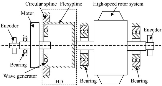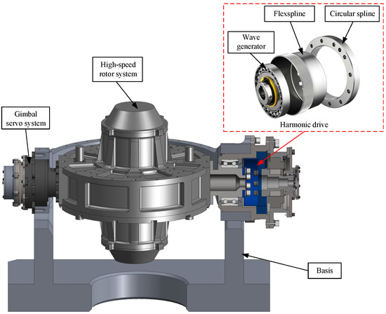 The structure of the gimbal servo system of SGCMG is shown in Figure 2. It is mainly composed of the motor-side encoder, bearings, permanent magnet synchronous motor (PMSM), harmonic drive, high-speed rotor system and load-side resolver.