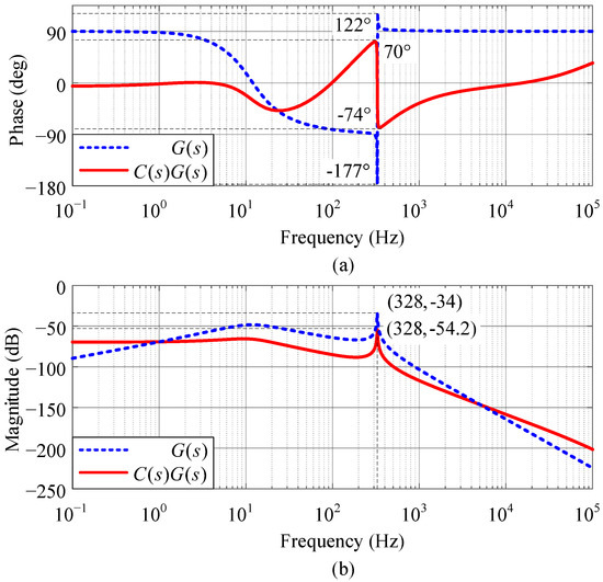 The blue-dotted wave of Figure 8 shows the Bode plot of . It can be seen from Figure 8a that the original phase range of is , which does not satisfy (21). Therefore, a phase compensator needs to be appropriately designed.