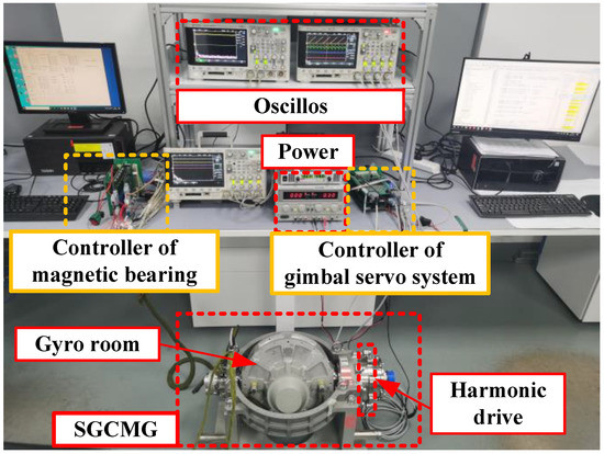 The single gimbal control moment gyro (SGCMG) is the primary attitude control actuator of large spacecraft because of good dynamic performance, high control accuracy and large output torque [1,2]. As shown in Figure 1, SGCMG is mainly composed of the high-speed rotor system and a gimbal servo system. The output torque of the SGCMG is , where H is the angular momentum of the high-speed rotor, and is the angular speed of the gimbal servo system [3,4]. When the high-speed rotor runs stably, the value of H remains constant, and the output torque accuracy of the SGCMG is dependent on the precision of the [5,6].