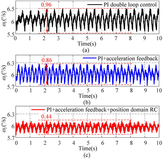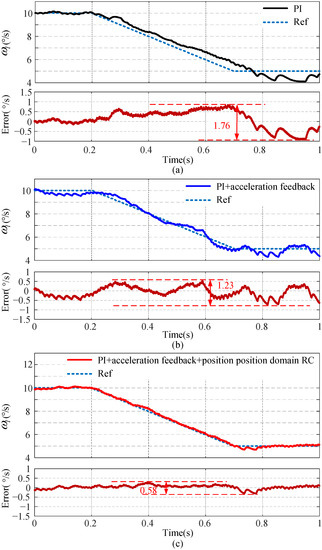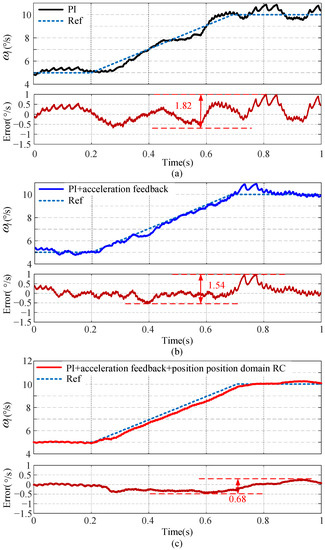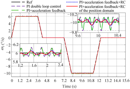 With the reference speed of 6, Figure 12 shows the steady-state speed curves corresponding to different control methods. The peak-to-peak speed error value of the PI double-loop control and the PI + acceleration feedback was about 0.96 and 0.86, respectively. Compared with the two aforementioned methods, when the position domain RC method was introduced, the peak-to-peak value became only about 0.44 which was decreased about 54.17% and 48.83%, respectively. From the results, it can be seen that the position domain RC method has the best speed fluctuation inhibition effect under the constant speed condition.