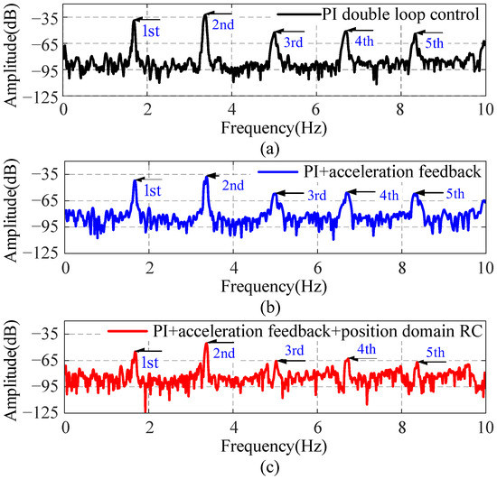 Experimental results of the steady-state response in frequency domain speed: (a) PI double loop control; (b) PI+acceleration feedback; (c) PI+acceleration feedback+position domain RC.
